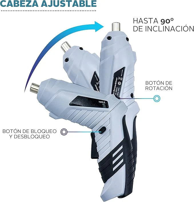 ✅ Product Information Category: Electric Screwdriver / Mini Drill Kit Size: Not specified (handheld, compact) Color: White with Black & Silver Accents Key Materials / Components: – German-engineered TBH Motor – Copper-coated coils – Silver gear system – USB rechargeable battery (3.6V) – Interchangeable drill/screw bits