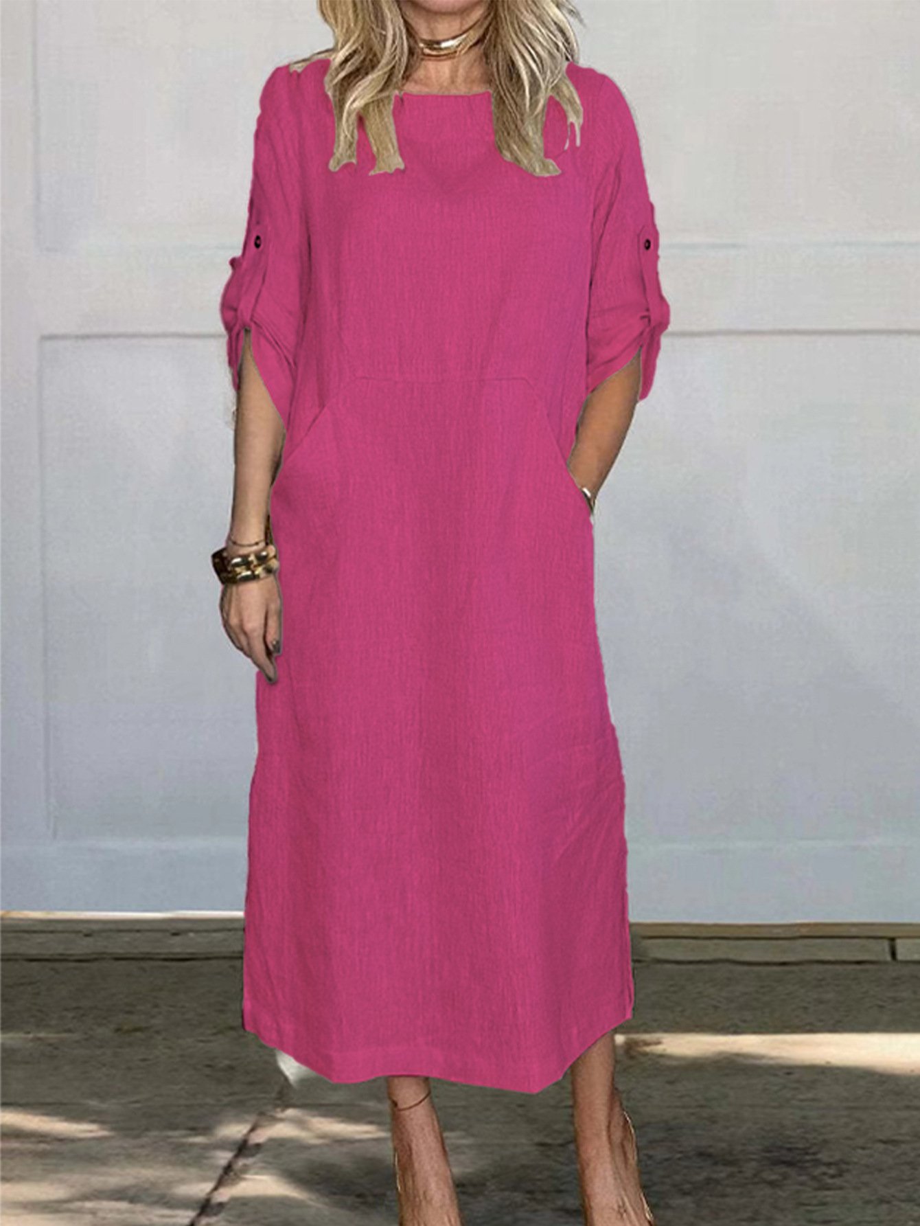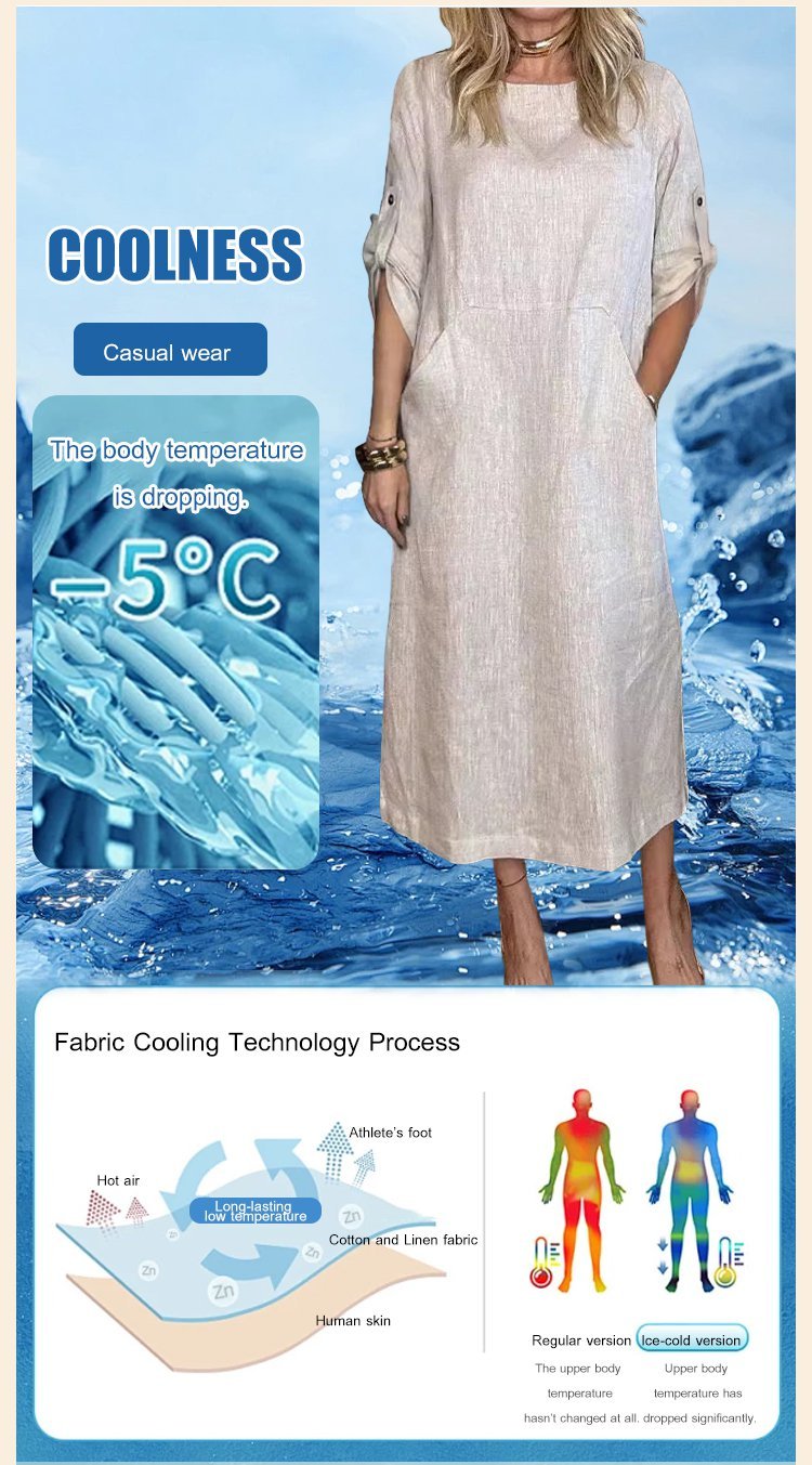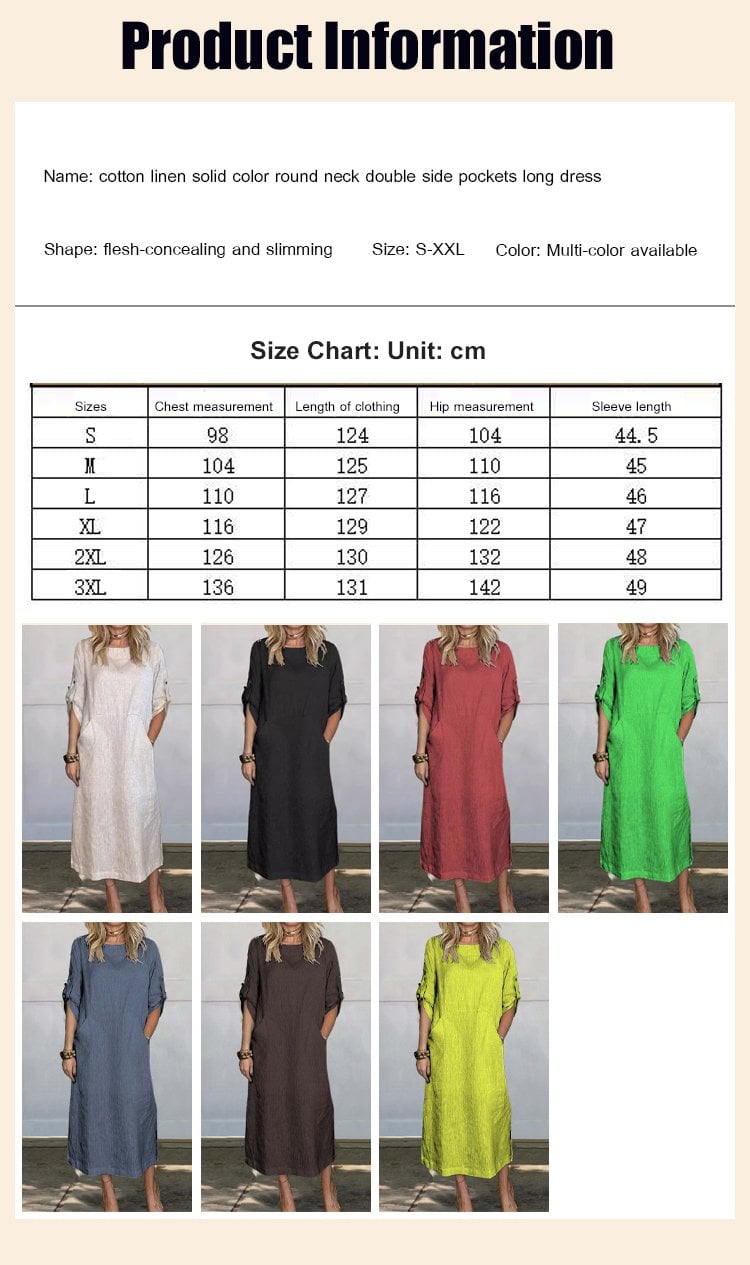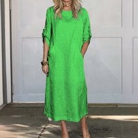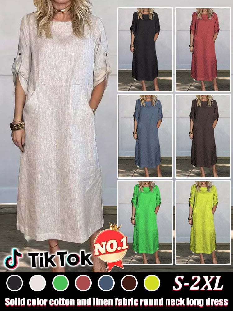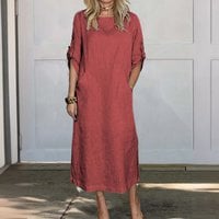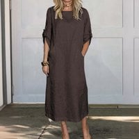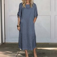 Cotton and Linen Solid Color Round Neck Double Side Pocket Long Dress
