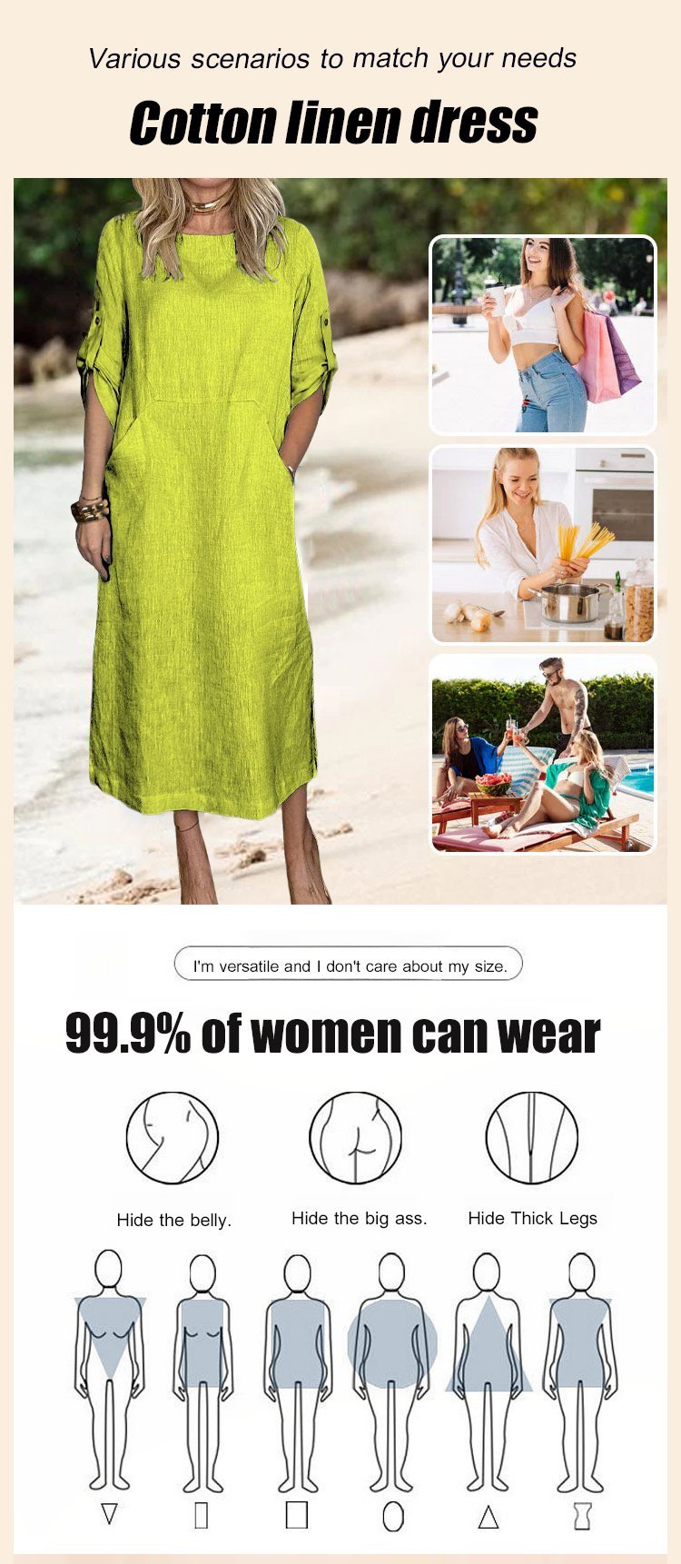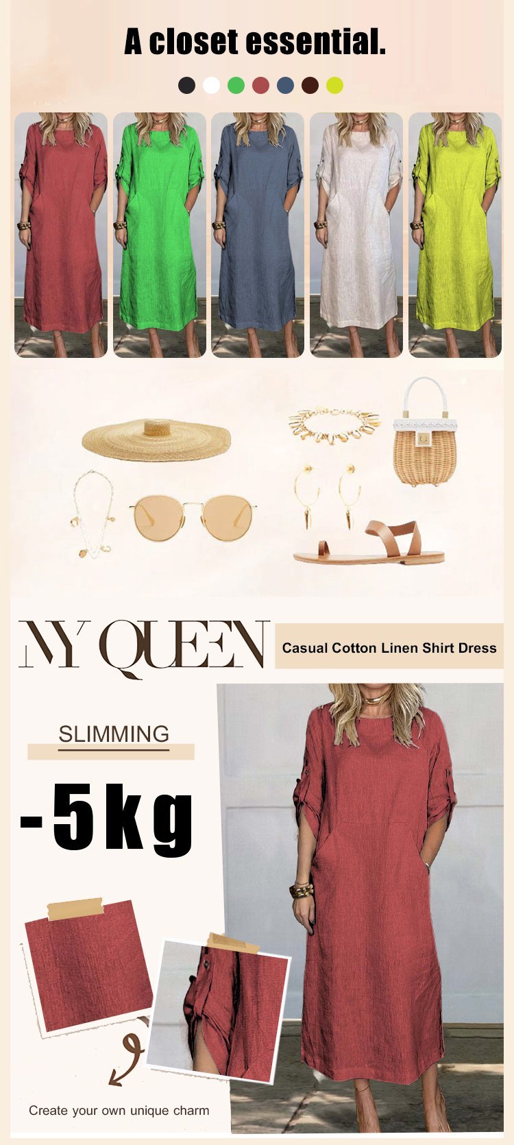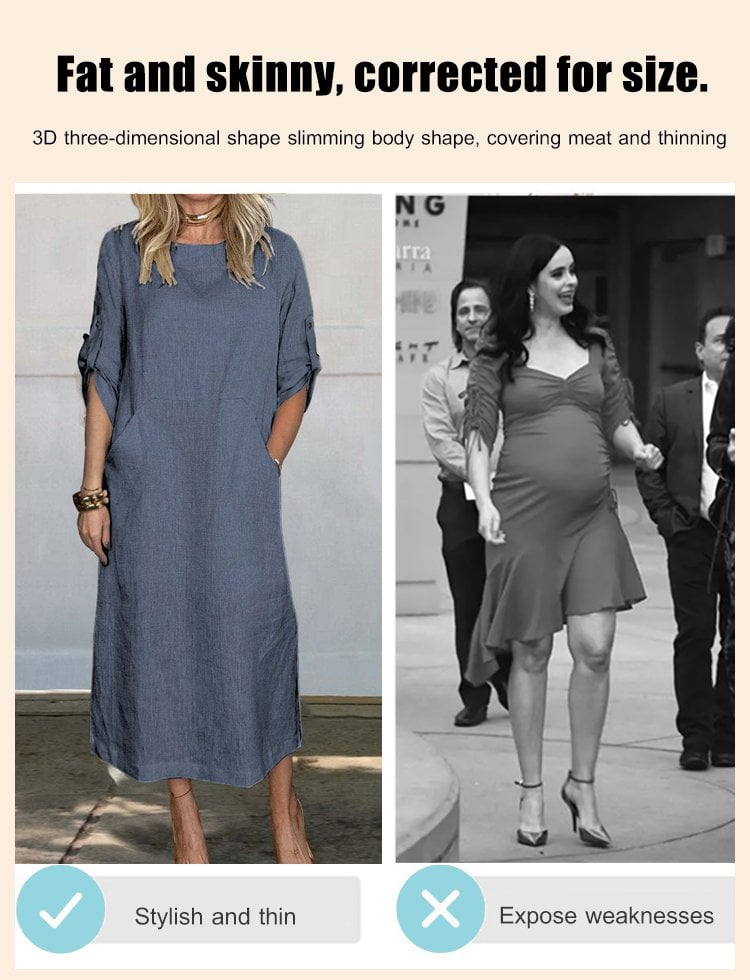 Cotton and Linen Solid Color Round Neck Double Side Pocket Long Dress