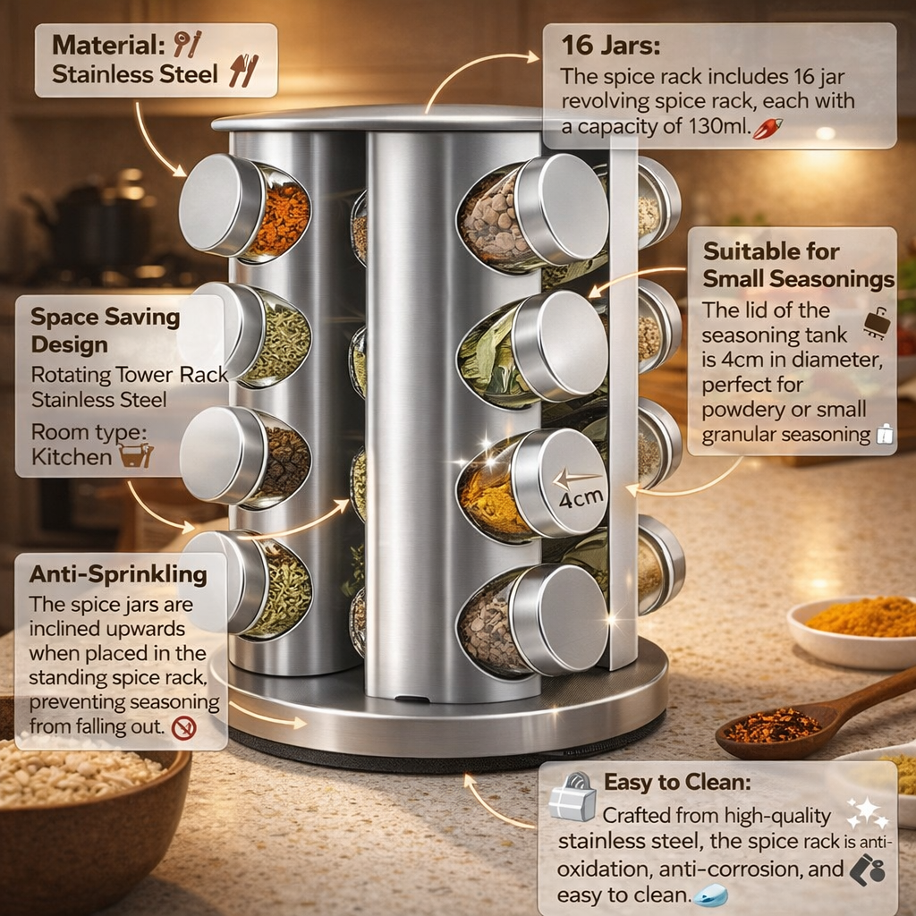 Easy to Clean: Crafted from high-quality stainless steel, the spice rack is anti-oxidation, anti-corrosion, and easy to clean. 🧼