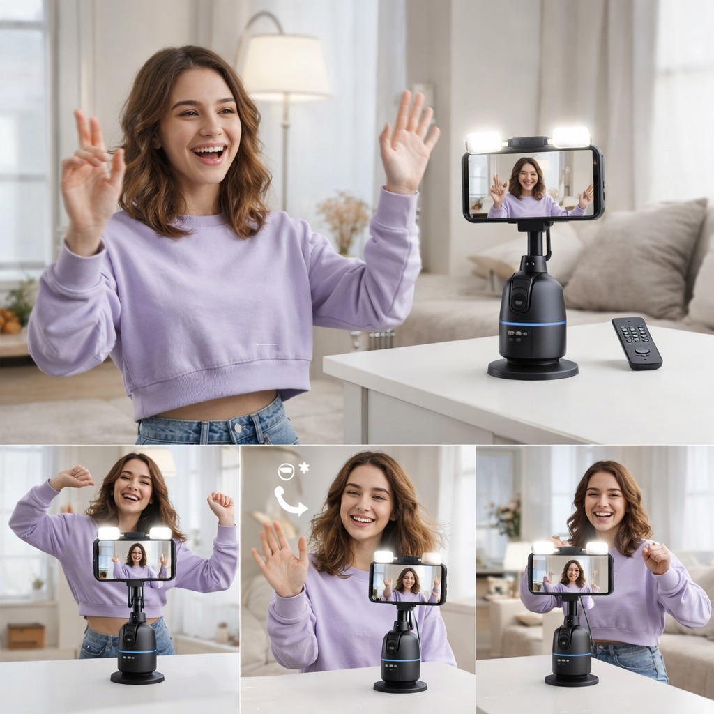✔ 360° Horizontal Rotation – Automatically follows your face during movement to keep you centered in the frame—ideal for vlogs, live sessions, and dance videos.