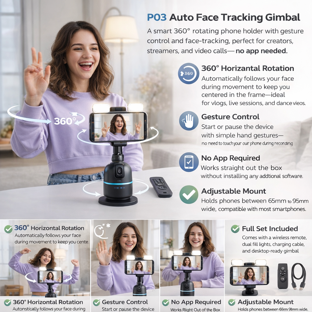 P03 Auto Face Tracking Gimbal – A smart 360° rotating phone holder with gesture control and face-tracking, perfect for creators, streamers, and video calls—no app needed.