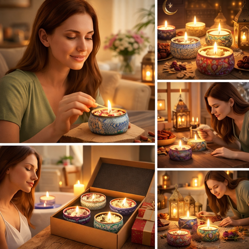 Housed in intricately patterned tins, these candles are perfect for home décor, gifting, aromatherapy, Ramadan evenings, weddings, or cozy nights at home. They don’t just smell beautiful — they look like art pieces, adding warmth and style to any space.