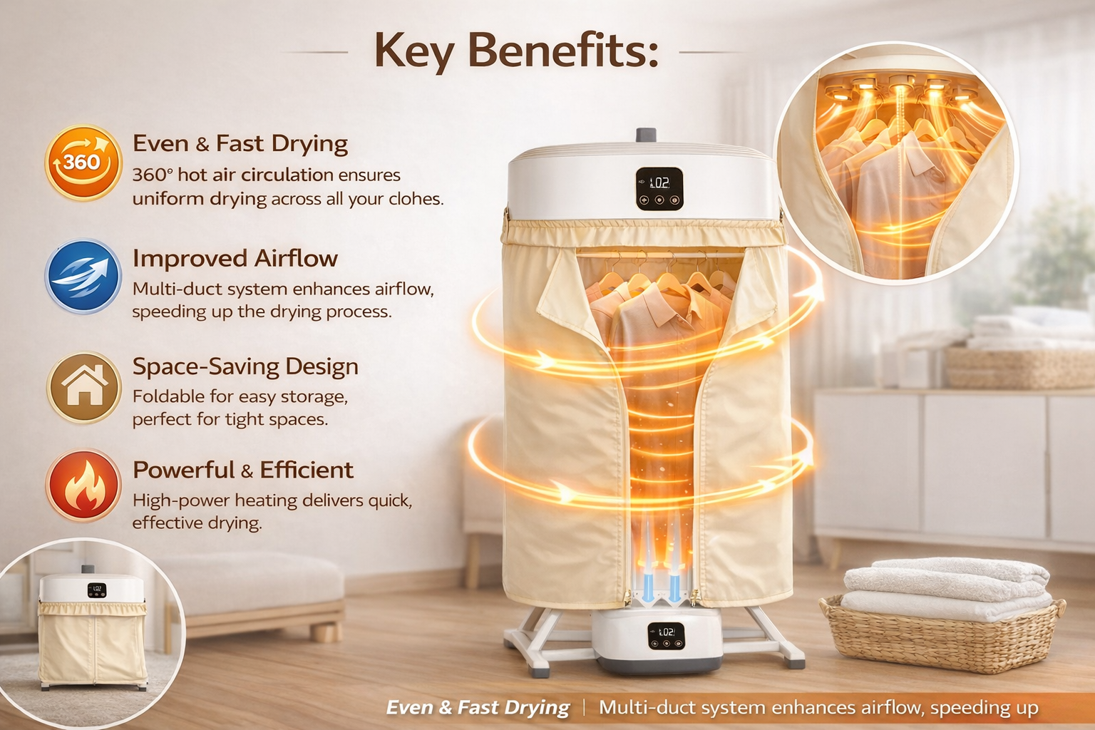 Even & Fast Drying: 360° hot air circulation ensures uniform drying across all your clothes.