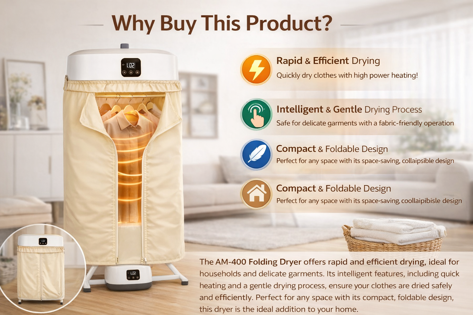The AM-400 Folding Dryer offers rapid and efficient drying, ideal for households and delicate garments. Its intelligent features, including quick heating and a gentle drying process, ensure your clothes are dried safely and efficiently. Perfect for any space with its compact, foldable design, this dryer is the ideal addition to your home.