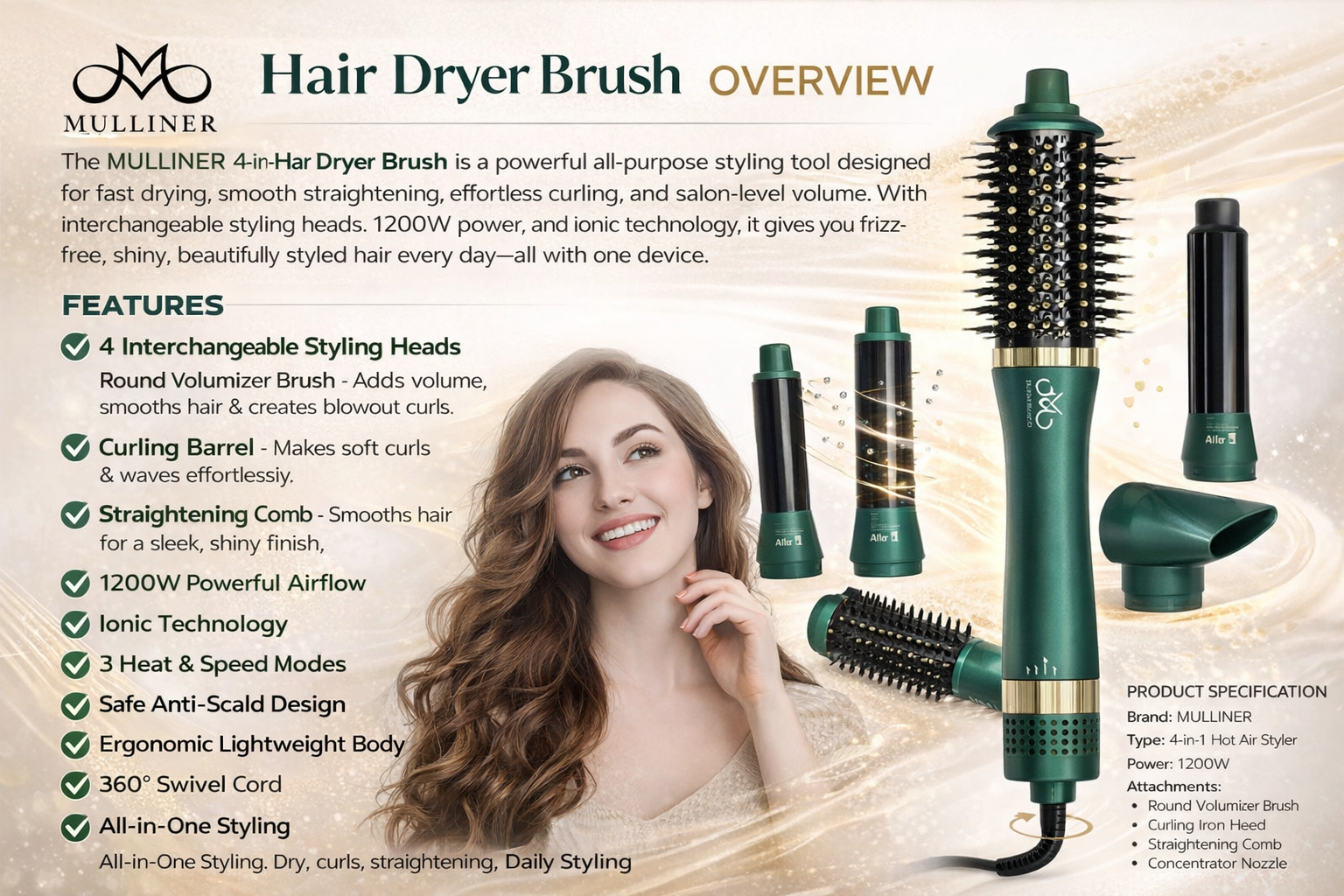 The MULLINER 4-in-1 Hair Dryer Brush is a powerful all-purpose styling tool designed for fast drying, smooth straightening, effortless curling, and salon-level volume. With interchangeable styling heads, 1200W power, and ionic technology, it gives you frizz-free, shiny, beautifully styled hair every day—all with one device.