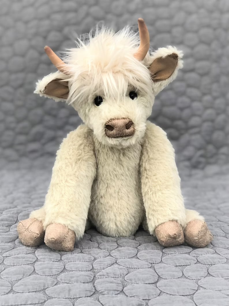 I am so proud to introduce "Hamish" a beautiful White Highland Cow. This cow is created in beautifully soft winter white alpaca, and is completely hand made taking over 45 hours to complete.