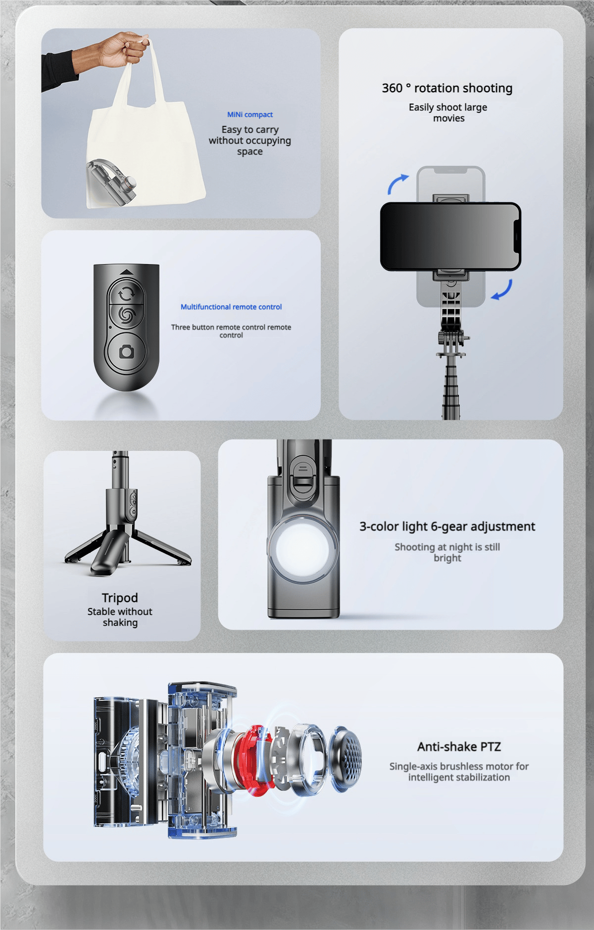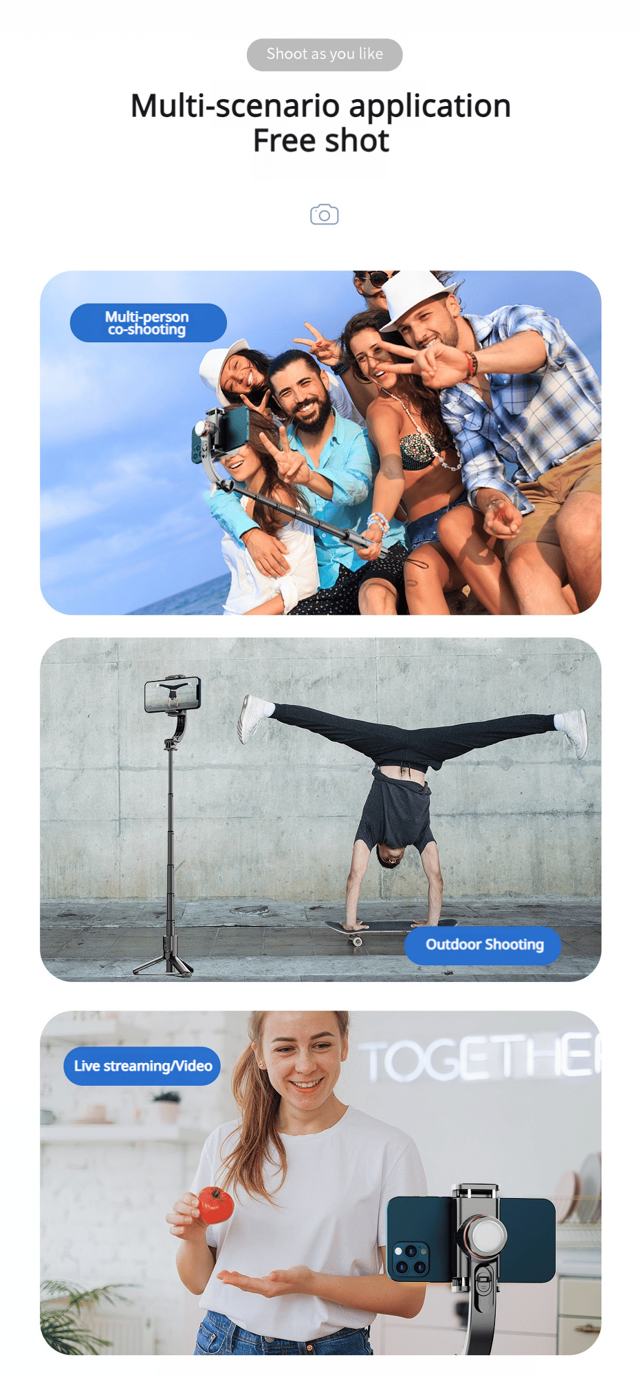 【FREEDOM】Live out your artistic side when the moment is right. You can use this handy stabilizer to create photos and videos anytime and anywhere without blurring anything on them. Thanks to its compact design, it fits in any pocket.