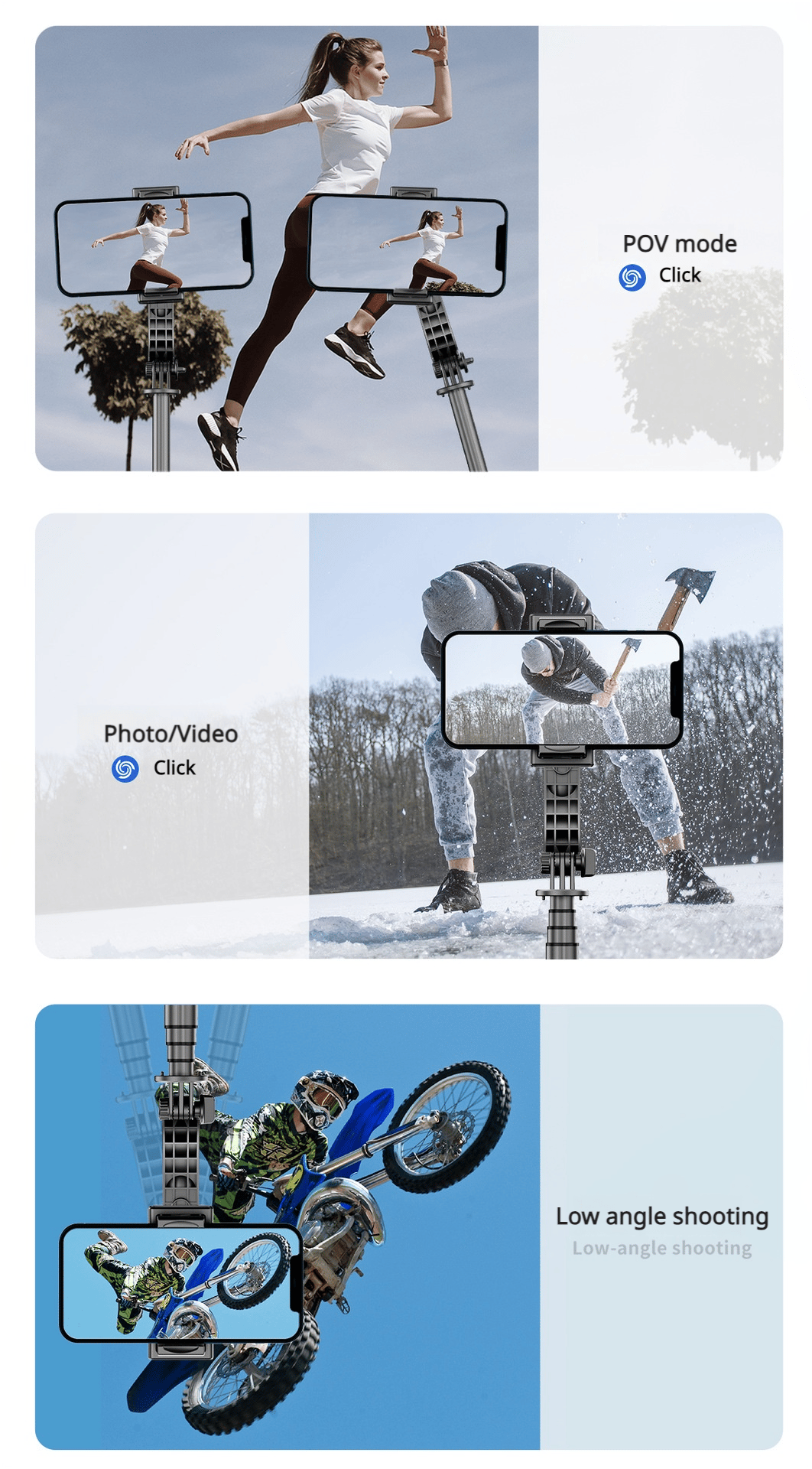 Tripod Mode (shown in product image) – Doubles as a stationary camera setup for hands-free use.