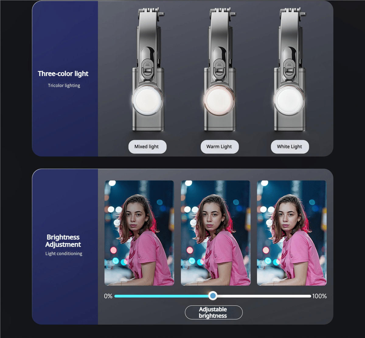 【Fill light function】smart phone stabilizer Unlike other stabilizers, this stabilizer has fill light. The optical honeycomb bead allows for natural brightness and size regeneration. It has three light modes (warm, natural and white), each with three brightness levels. Even when shooting at night, these images are clearly visible