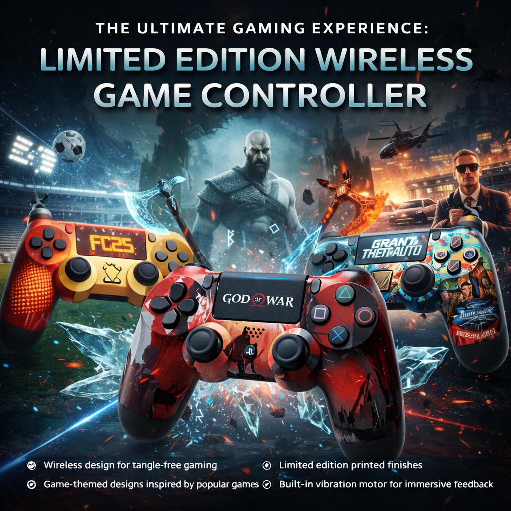 Limited Edition Wireless Game Controller features eye-catching game-themed designs with wireless connectivity and vibration support, offering an immersive and stylish gaming experience.