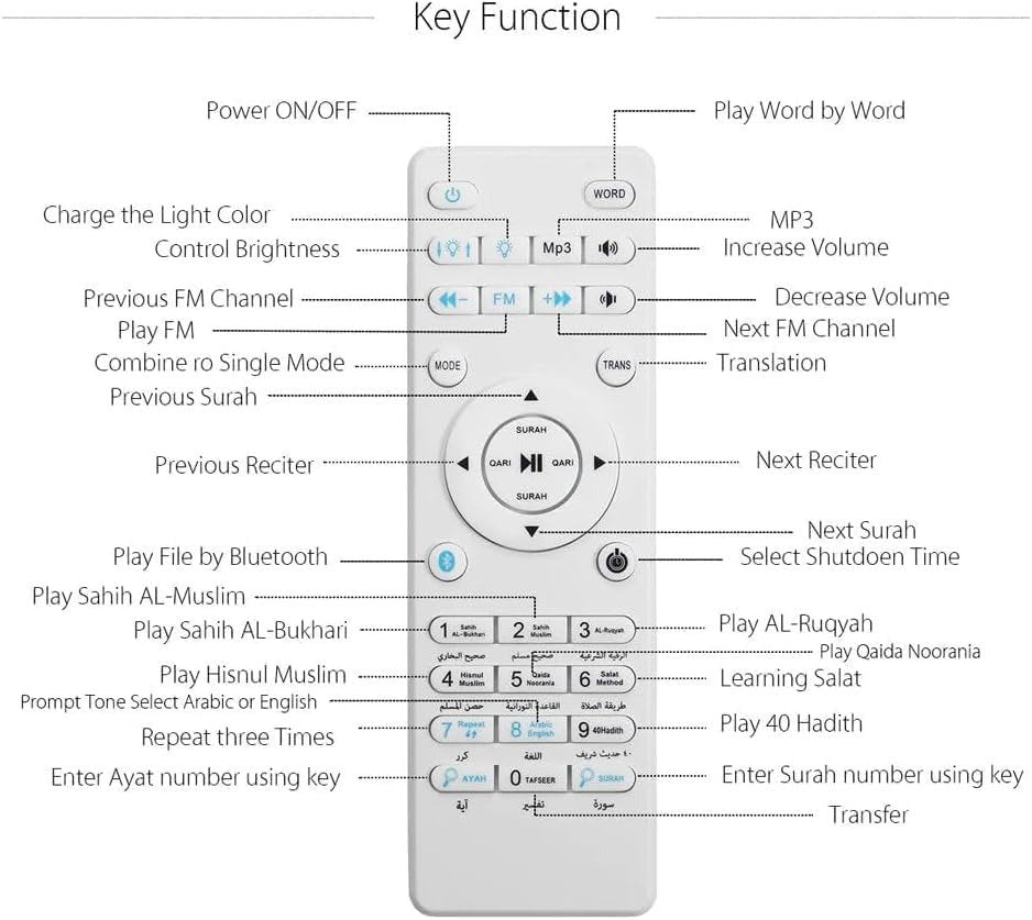 • Multifunctional Smart Control Speaker:It's a 5 - in - 1 device: Quran speaker, wireless music player, hands - free phone, bedside lamp, and color - changing night light.