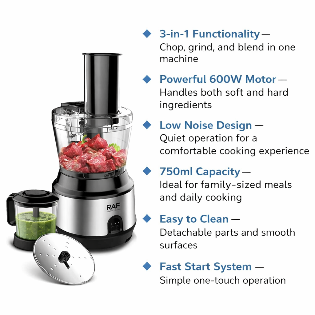 RAF 3-in-1 Food Processor 600W – 750ml Capacity | Powerful & Easy to Clean Kitchen Machine