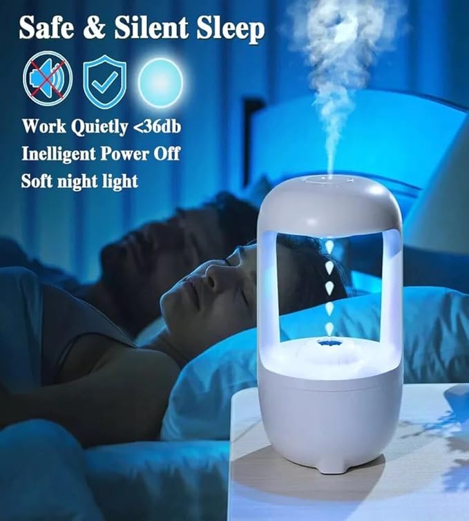Anti-Gravity Humidifier – A visually stunning humidifier with an innovative optical illusion design, making water droplets appear to flow upwards while humidifying and glowing softly. Perfect for relaxation, sleep, and home décor.